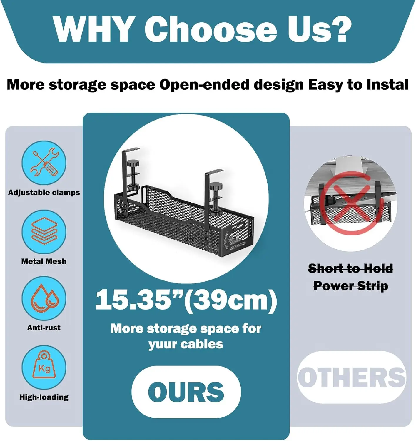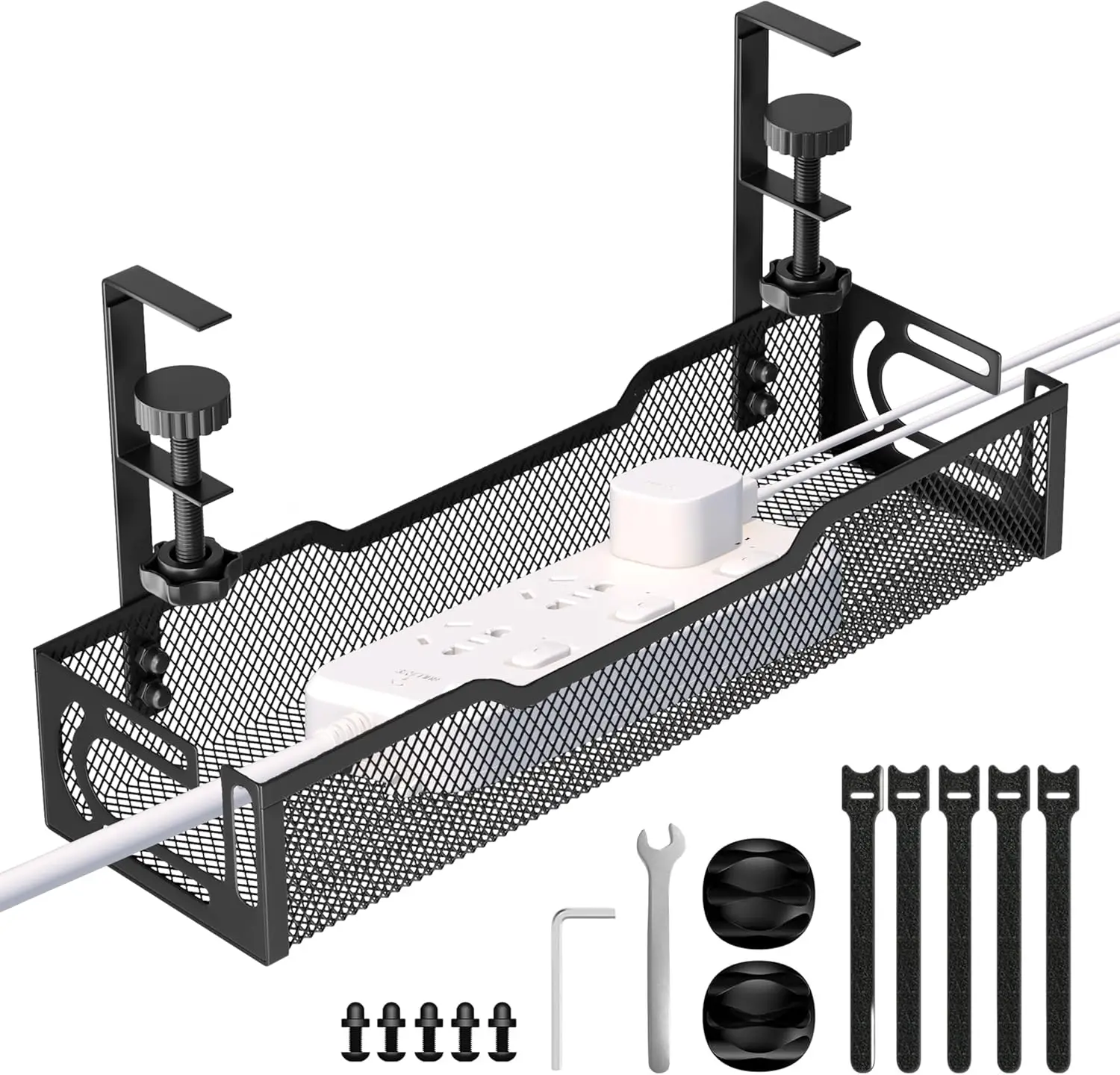 This under-desk cable management kit can be installed on most desktops with a thickness between 0.4 inches and 2.08 inches (1~5.3 cm).