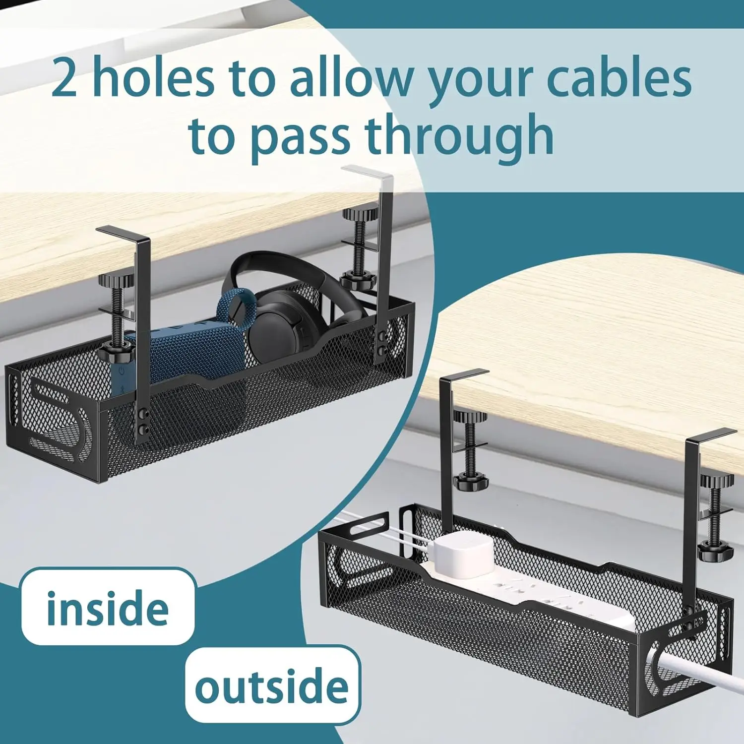 - 2 adhesive cable clips to secure charging cables and prevent them from slipping under the desk,